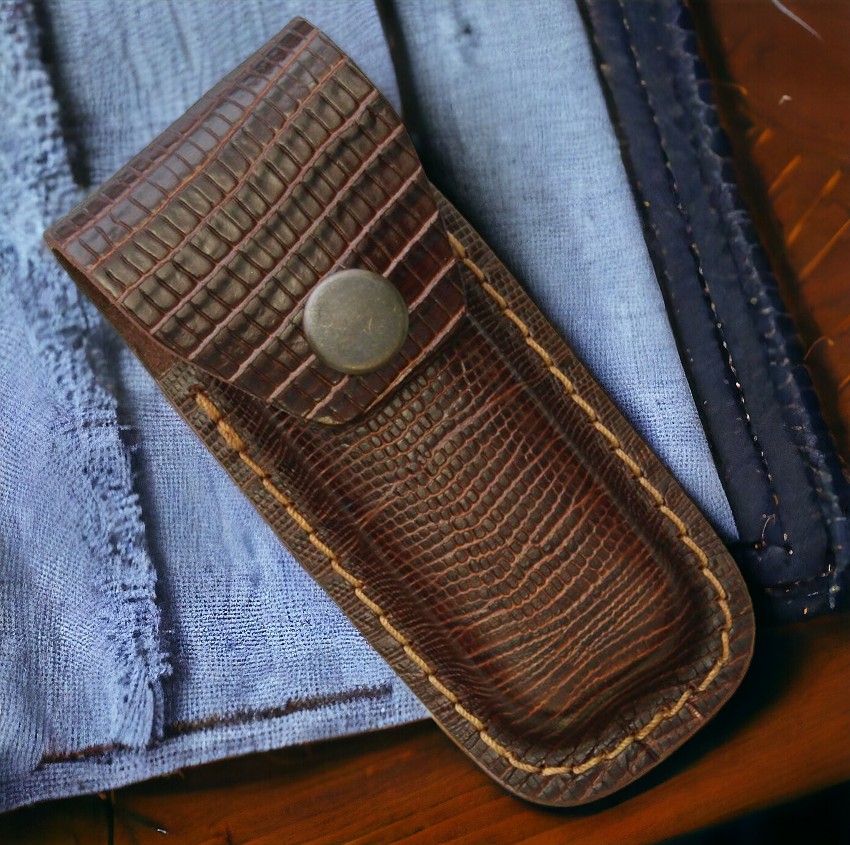 Introducing our NEW Alligator Style Leather Folding Knife Sheath, designed to fit folding knives with a closed length of 3 to 3.5 inches. This sheath features a striking lizard-style pattern on high-quality leather, combining style and functionality for your knife.